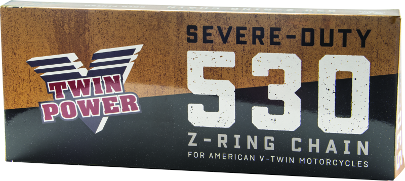 Twin Power™ Drive Chain for American V-Twins. High-tensile steel, solid rollers and oversize pins ensure longer life and higher strength. The 530 Heavy-Duty is a perfect replacement chain for classic V-Twins with an average tensile strength 7,700 lbs. Includes clip style master link with a natural finish. 530 Z-ring provides the ultimate strength for all performance applications with an average tensile strength of 11,200 lbs. Includes rivet style master link with a gold finish.